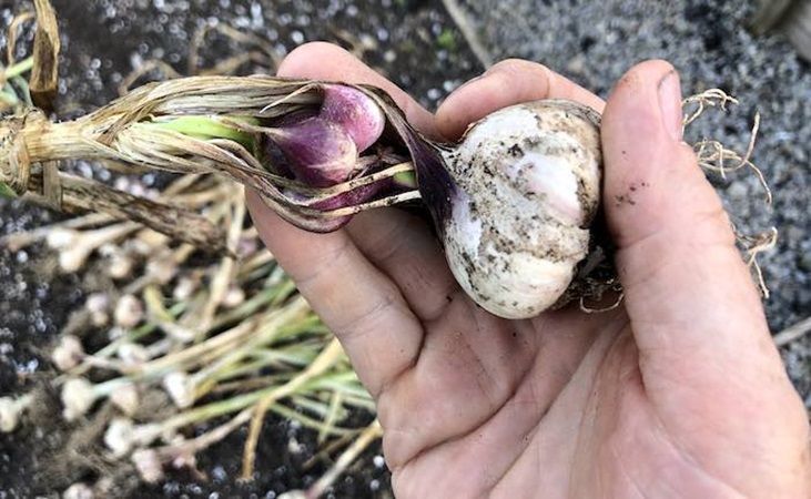 If you grew softneck garlic this year yourself, you may have noticed little garlic cloves growing in the stem - either just above the main bulb or further up the stem. I usually see one or two but had a large amount this season, the most I have ever seen.